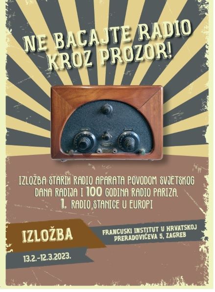 Pozivano sve zainteresirane na izložbu starih radioaparata koje se organizira povodom svjetskog dana radija te 100 godina Radio Parisa. Izložba je otvorena od 13.02.2023. - 12.03.2023. a postavljena je u Francuskom institutu u Hrvatskoj, Preradovićeva 5 u Zagrebu. Radno vrijeme izložbe je svaki radni dan od 12.00 do 19.00 sati, a subotom od 10.00 do 14.00 sati |